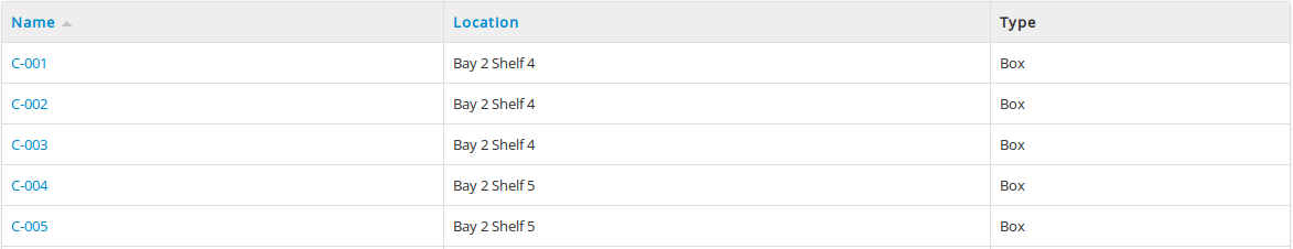 Once in Browse Physical storage, users have the option of sorting the storage entries by Name (of container) or Location by clicking in the first row of the Physical storage table: