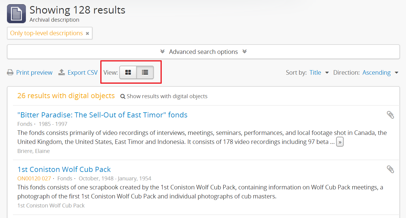 For more information on navigating in AtoM, see Searching in AtoM and Navigating in AtoM.