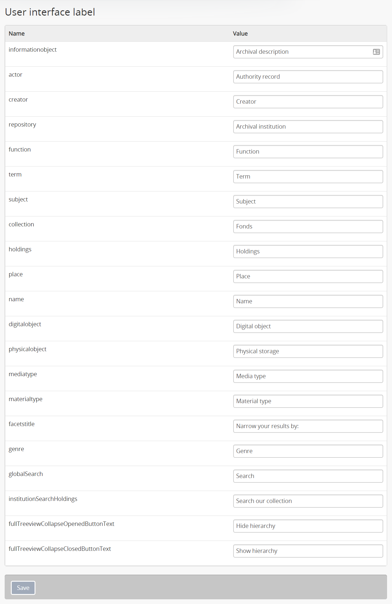User interface labels can be changed by administrators by entering a new label(s) into the field(s) under the “Value” column. Changes will only be saved once the “Save” button is clicked. Changing the label will change its appearance throughout AtoM for both authenticated (logged-in) and public users.