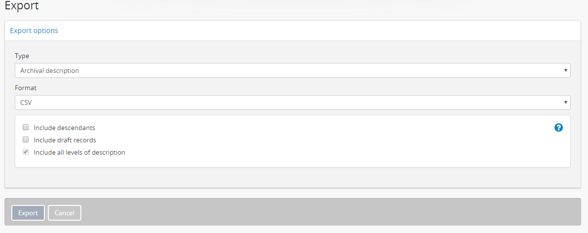 1. AtoM will redirect you to a page where you can configure your export. Make sure the Format drop-down menu is set to “CSV”.