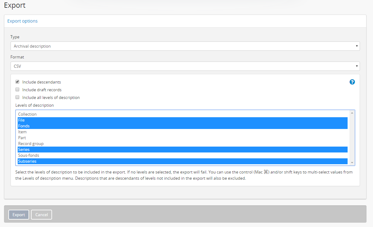 AtoM will then display a list of all levels of description from the Levels of description taxonomy. You can use your Control (Mac users: Command) and Shift keys to multi-select the levels you want included in the export.