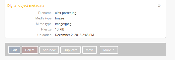 2. Click on the “More” button in the button block; from the menu that appears, select “Edit digital object”. You will be redirected to the digital object’s edit page.