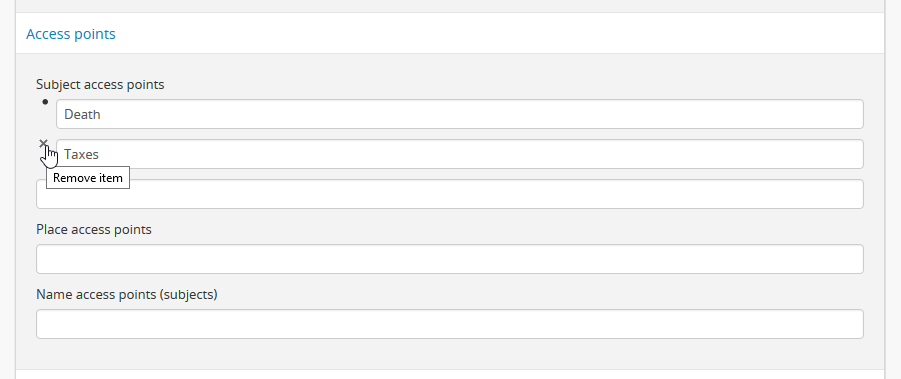 Access points can be added by users with edit permissions on the fly (without leaving an archival description) from an archival description edit page by simply adding a new subject or place to the corresponding field in the Access points area.