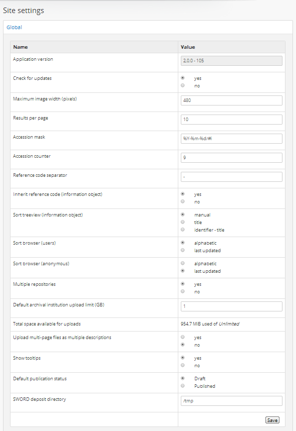 When making changes to the global settings in AtoM, don’t forget to click the “Save” button in the button block, located at the bottom of the “Global” settings information area.
