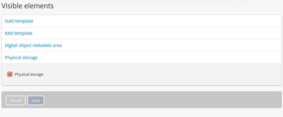 Visible elements enables an administrator to “hide” specific fields in the database from the public (i.e., unauthorized users, or users who are not logged in). It also allows administrators to hide the Physical storage area.