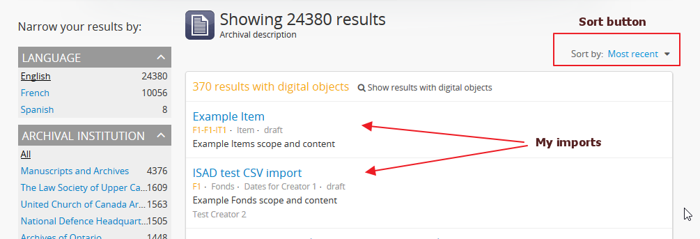 To specify a parent that exists in AtoM, you must first take note of the parent information object’s slug. The “slug” is a textual identifier that is included in the URL used to view the parent description. If the URL, for example, is http://myarchive.com/AtoM/index.php/example-fonds then the slug will be example-fonds. This slug value would then be included in your import in the qubitParentSlug column in the rows of children of the parent description.