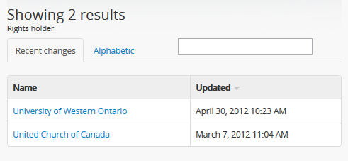 On search and/or browse pages for rights holders and functions, the same sort options are presented as tabs the user can click to change the view - clicking the inactive tab will reload the page in the new sort order (alphabetic, most recent, or identifier).