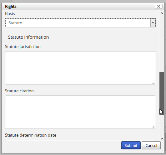 In this example, a user has selected “Statute” as the Rights basis, and more fields have appeared in the rights dialog.