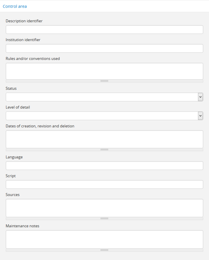 The data entry fields for the Control area of the ISDIAH archival institution template.