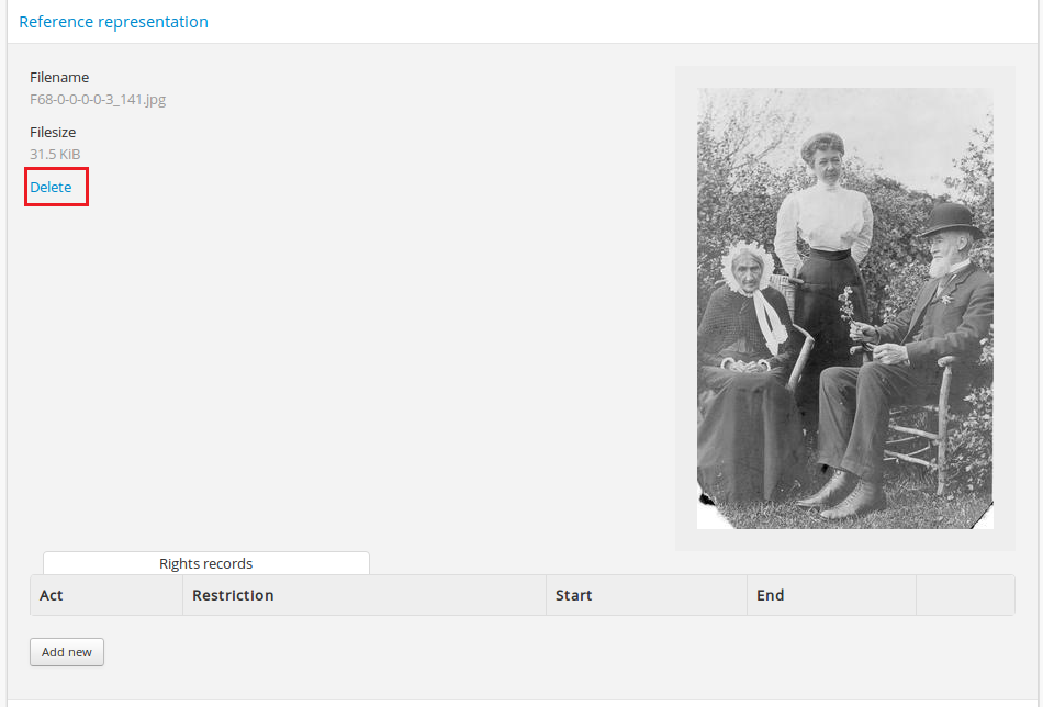 1. If you wish to use a different image as the thumbnail or reference version this is also performed from the Edit digital object screen. First click delete in Reference representation or Thumbnail area.