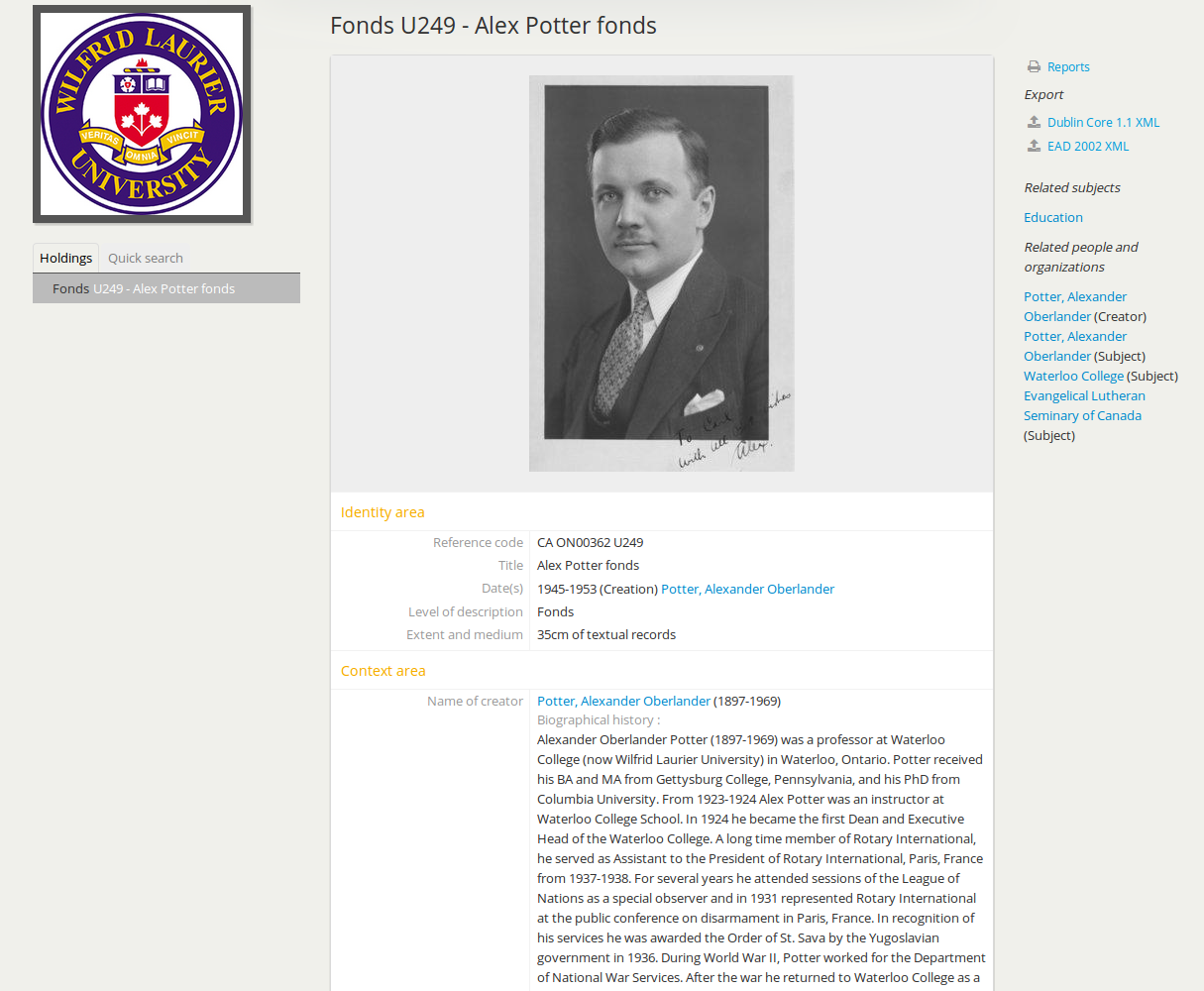 Navigate to the View archival description screen and select the level of description (e.g., fonds, series, file etc.) that you want to view. For general purposes the highest level will provide you with an overview of the materials in context and consolidate information about the fonds including extent and medium, scope and content, admin/biographical history and rights.