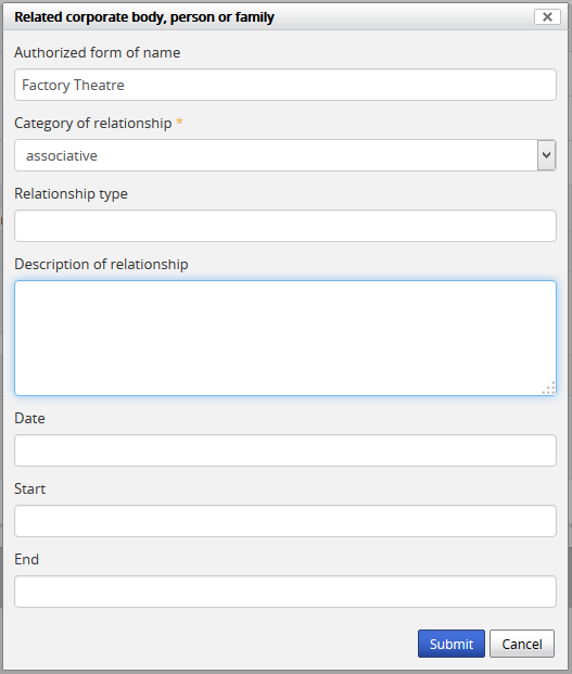 - AtoM will open a pop-up dialog where you can select the related authority record and define the nature and time frame of the relationship.