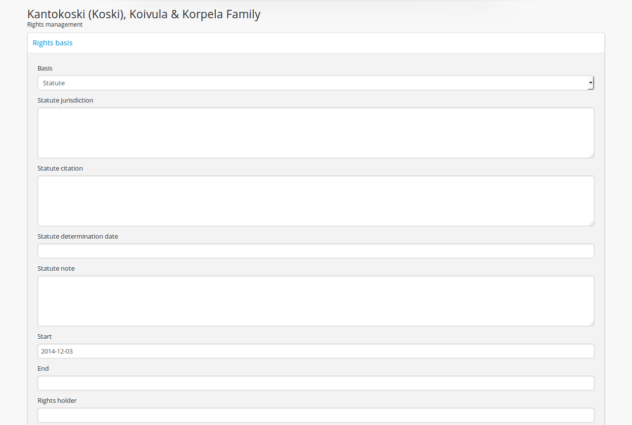The fields below the rights basis will differ depending on the basis chosen. Compare for example the figure above, showing Copyright as the basis, and the figure below, showing Statute as the basis: