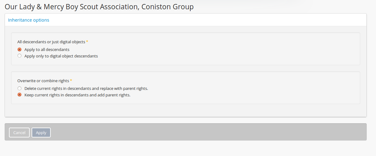 AtoM will allow you to add a rights record to a parent record and choose whether or not the same rights record should be applied to that parent’s child records.