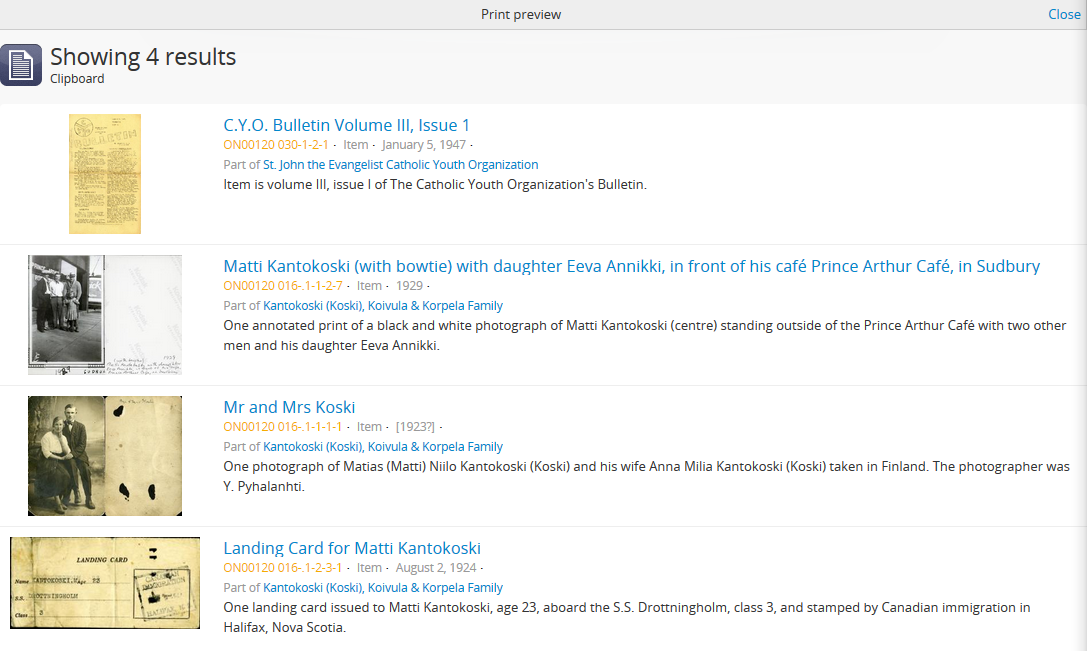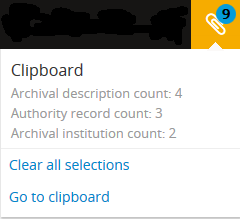 The following sections will introduce you to the Clipboard and the Clipboard menu in the AtoM header bar, as well as how the Clipboard can be used.