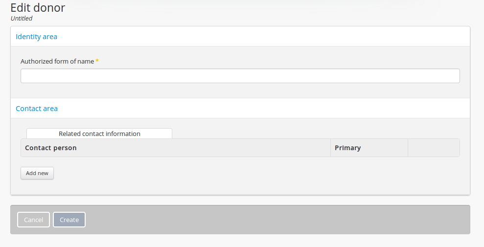 1. AtoM will redirect you to a blank Donor record in edit mode. Enter the new donor name and select “Add new” under the contact area to enter contact information about your new donor. Click “Submit” to close the contact information dialog and return to the donor record. When you are finished adding data, click on the Create button in the button block to save the new Donor record.