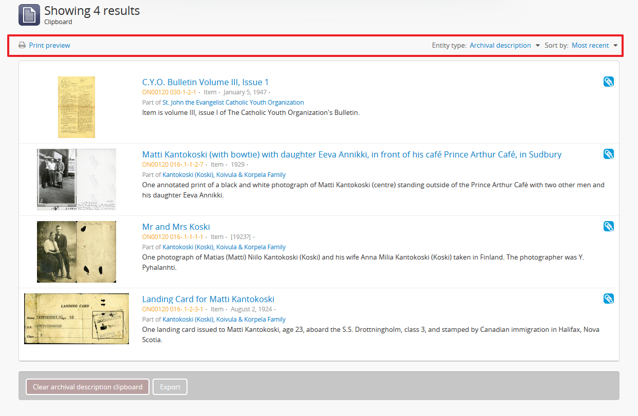 Your previously saved results will load. Note that if you have saved entries from different entity types, they will all be present, though they may not be immediately visible - AtoM shows only one entity type at a time, and by default will show archival description results first. You can switch entity types using the drop-down menu found at the top right above the clipboard results.