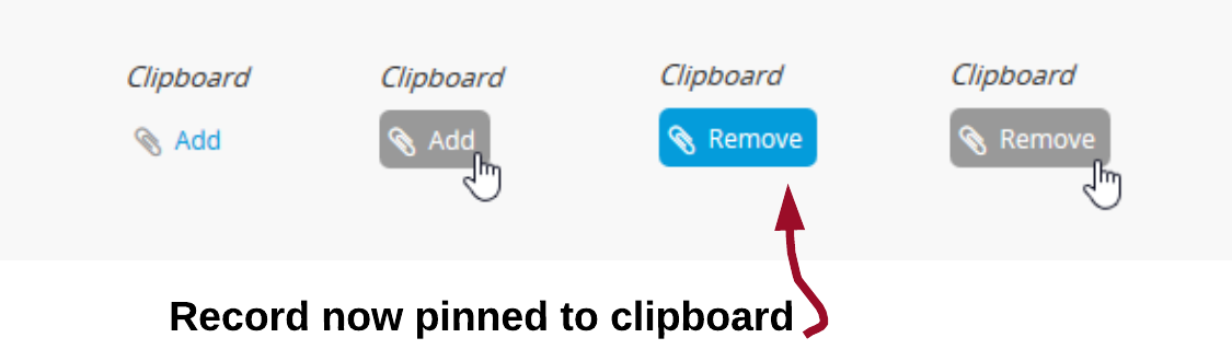 On the view page for an archival description, authority record, or archival institution record, the option to pin the current record to the clipboard is found in the right-hand context menu, under a “Clipboard” heading. When the item has not yet been pinned to the clipboard, the text link in the sidebar will read “Add”. Click the link to add the current description to the clipboard. Once selected, the link, now outlined in blue to indicate the item is pinned, will read “Remove” - click the link again to remove the item from the clipboard.