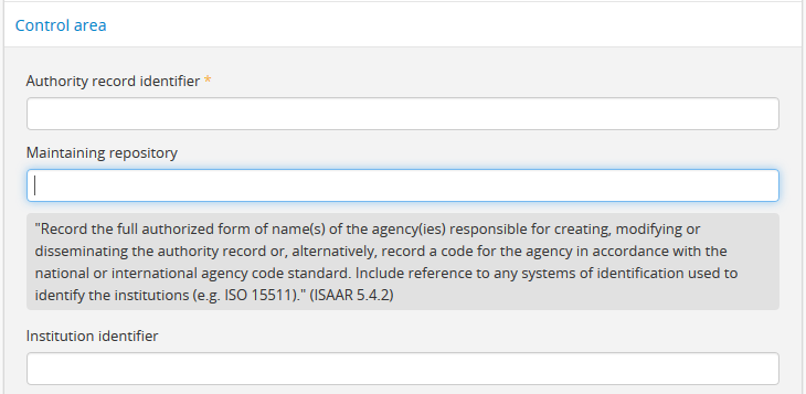 - Enter data as required. The authority record edit template is based on the ICA’s International Standard Archival Authority Record for Corporate Bodies, Persons and Families (ISAAR). For more information on the use of particular fields in the ISAAR authority record edit template, see: ISAAR(CPF).
