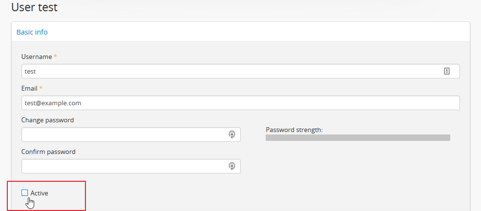 3. Mark the user as “Inactive” by unchecking the box next to “Active” Inactive in the “Basic info” information area of the user’s profile; a blank box will set that user’s status as “Inactive”.