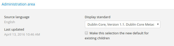 This fields allows the user to choose a different display standard from the default template for the shown archival description only, with the option to also change the display standard for all existing children of the description. See: Change the display standard.