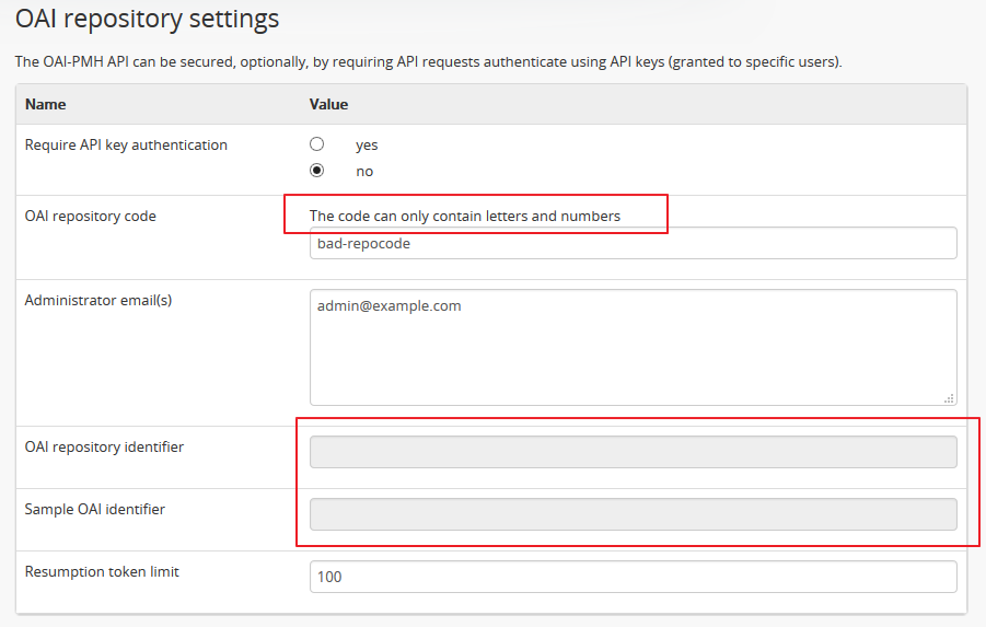 This field will only accept letters and numbers - any attempt to enter a symbol (e.g. a dash, underscore, or other special character) may break the OAI repository functionality. This will be indicated by the lack of an OAI repository identifier or sample OAI identifier in the controlled fields below, and by the tooltip that appears above the OAI repository code field: