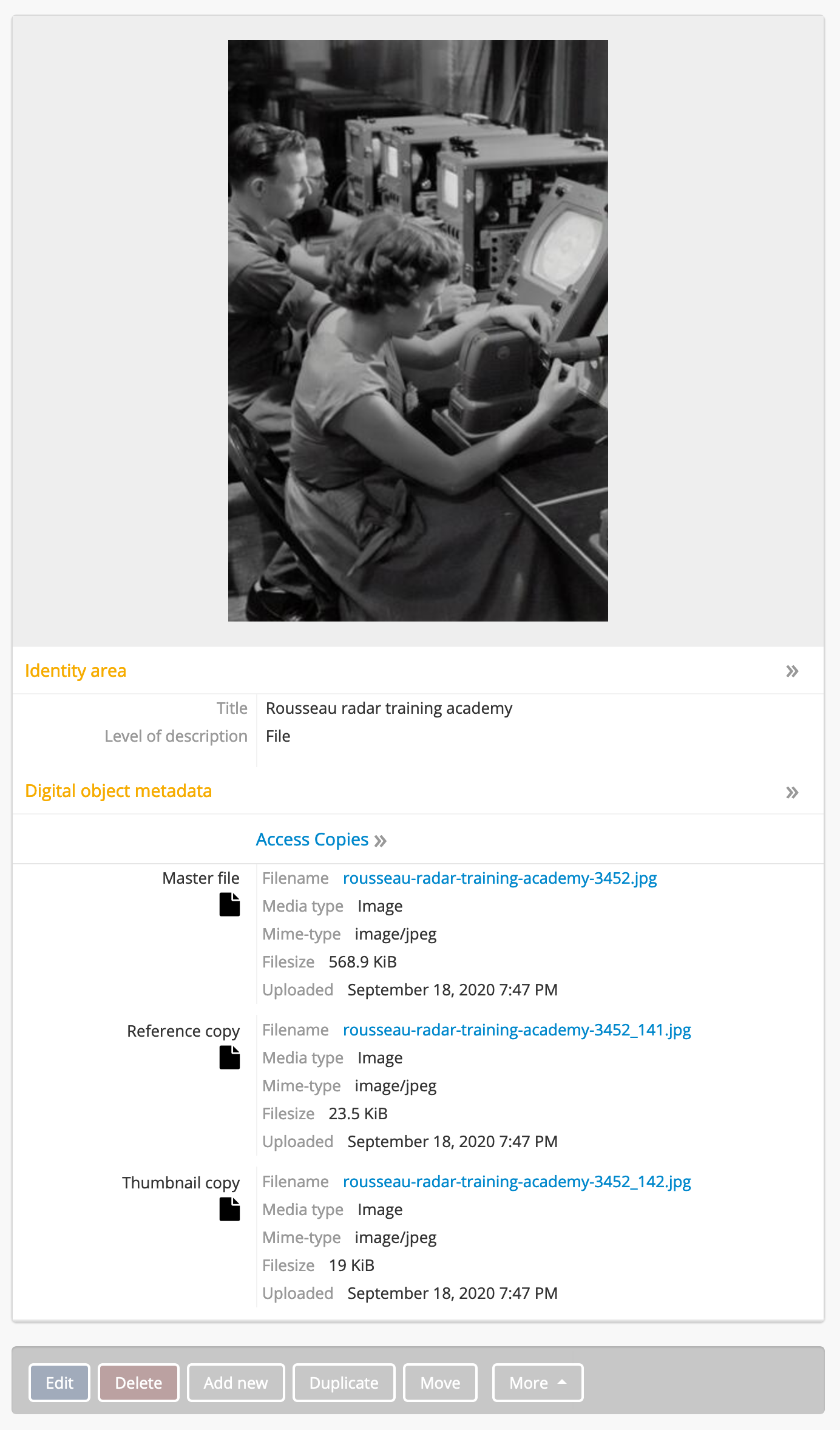 When the preservation system uploads a DIP with digital objects to AtoM, it will generate “Master file”, “Reference copy”, and “Thumbnail copy” representations with their metadata displayed in the “Access copies” subsection.