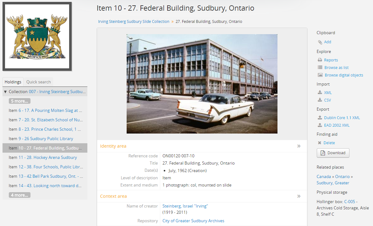 1. Navigate to the view page of an existing archival description with a linked digital object in AtoM. You can do this by browsing or by searching for a specific archival description - see Access content for more information on navigation in AtoM.