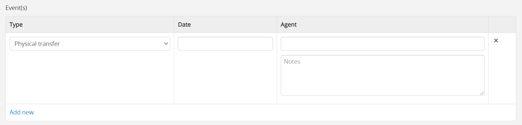 The entire block of related fields can be repeated as needed to capture additional events, by clicking the “Add new” link below the list of fields. You can also remove a row of related fields by clicking the X to the right of the field block.