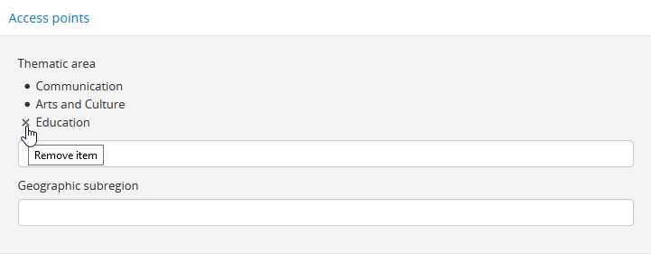 1. If a matching term does not exist, press the Tab key to exit the field, or use your cursor. A new term will be created in the related taxonomy (e.g. Geographic subregion or Thematic area) when the archival institution is saved.