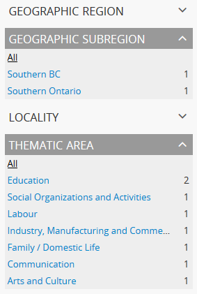 The Thematic area access point is intended to assist users in identifying major collecting areas of an archival institution by offering them a sense of the subject matter addressed in the holdings of the institution. AtoM includes a number of default terms (included in both French and English) in the Thematic area taxonomy, derived from the terms used in the Canadian Council of Archives’ Directory of Archives: