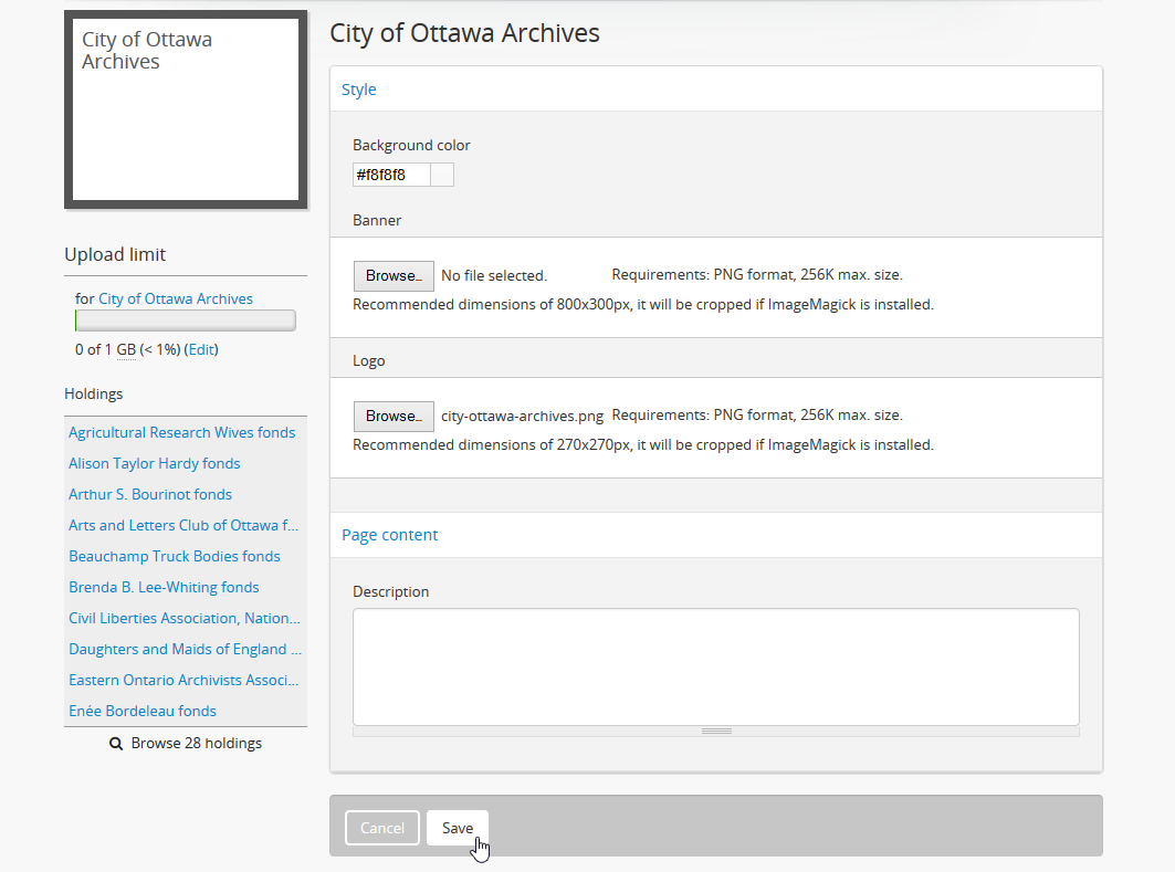 2. You can quit the theming process at any time by clicking the “Cancel” button in the button block; any changes made will not be saved and the existing logo will remain as such. Note that simply navigating away from the page by any other means, without first clicking “Save” will also result in no changes being saved to the archival institution.