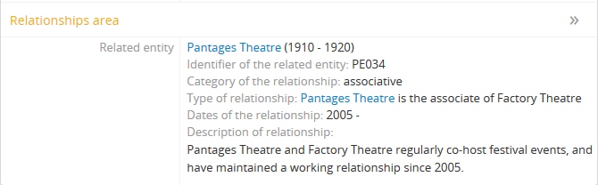 - AtoM will reload the authority record in view mode. relationship is expressed in the “Relationships” information area of the authority record’s view page, and the related record’s name will appear as a hyperlink.