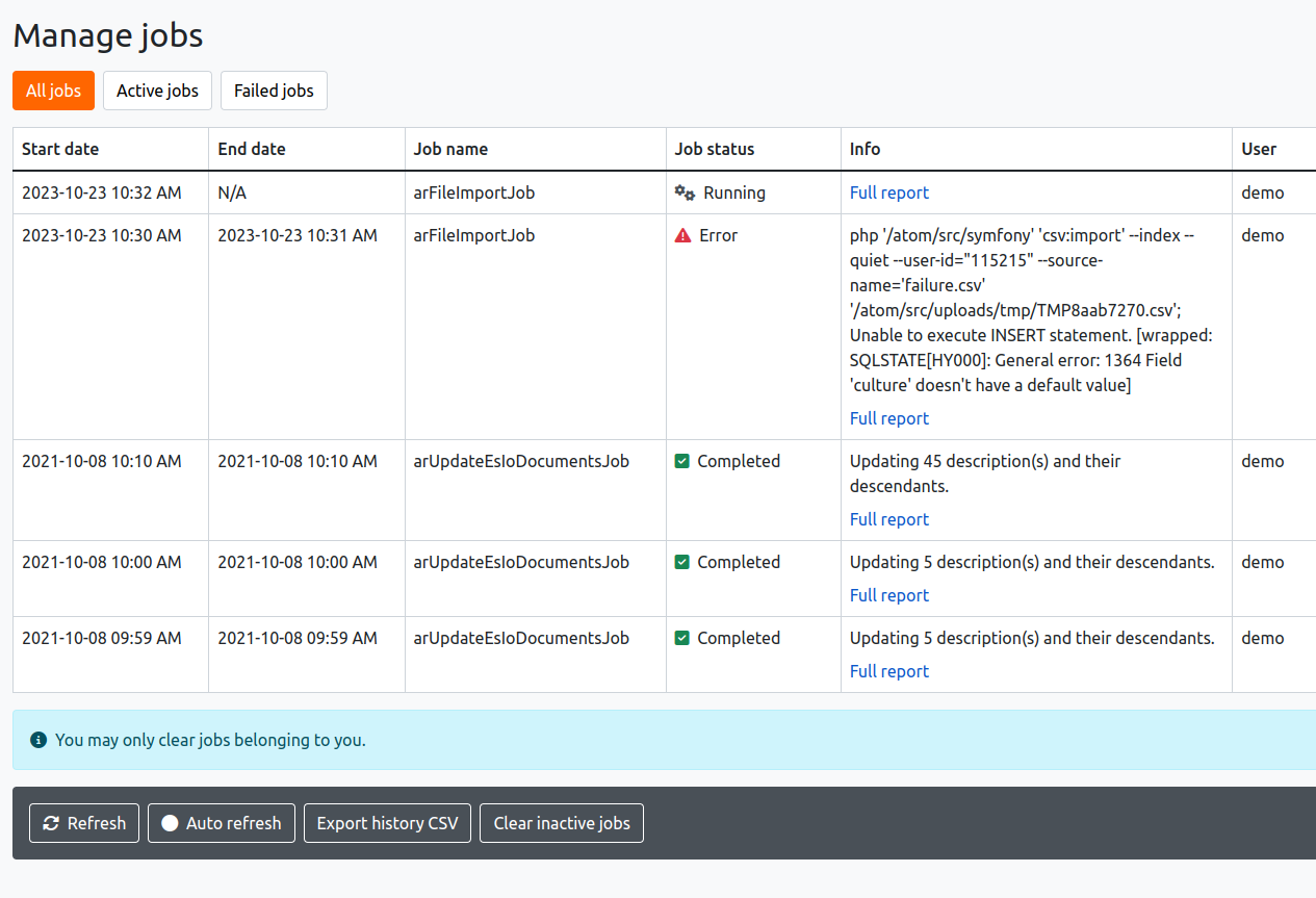 The Jobs page also includes tabs that allows users to view only those jobs that are currently still being executed (e.g., a status of “Running”) or jobs that have failed (e.g., a status of “Error”). These can be useful when a large number of jobs are being executed simultaneously, and/or the list of jobs has not been cleared in some time. Click on one of the other tabs to switch the view from “All jobs” to “Active jobs” or “Failed jobs”. AtoM will refresh the page and the table will be limited to the selected view.