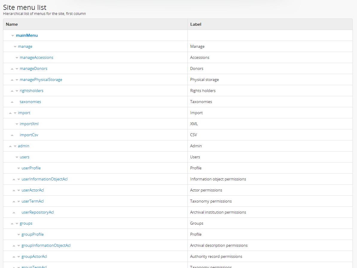 AtoM will direct you to the “Site menu list” view page. - Click on the blue menu name you wish to edit to be directed to that menu’s edit page.