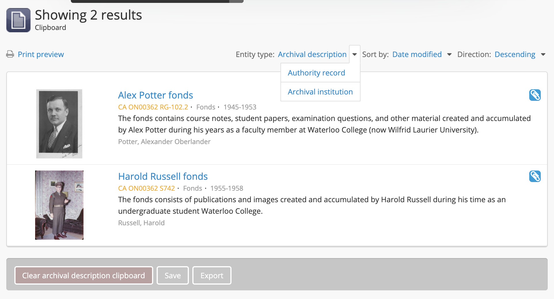 Your previously saved results will load. Note that if you have saved entries from different entity types, they will all be present, though they may not be immediately visible - AtoM shows only one entity type at a time, and by default will show archival description results first. You can switch entity types using the drop-down menu found at the top right above the clipboard results.