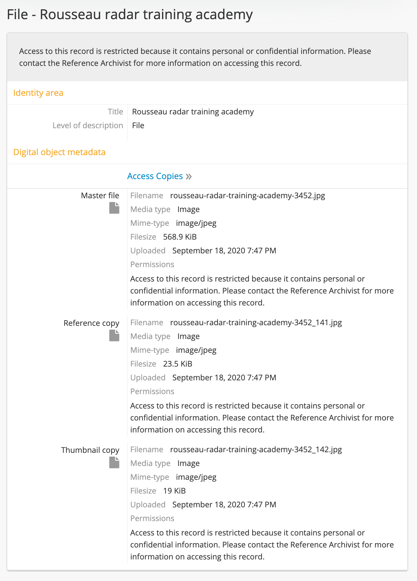 When the preservation system uploads a DIP with digital objects to AtoM, it will generate “Master file”, “Reference copy”, and “Thumbnail copy” representations with their metadata displayed in the “Access copies” subsection.