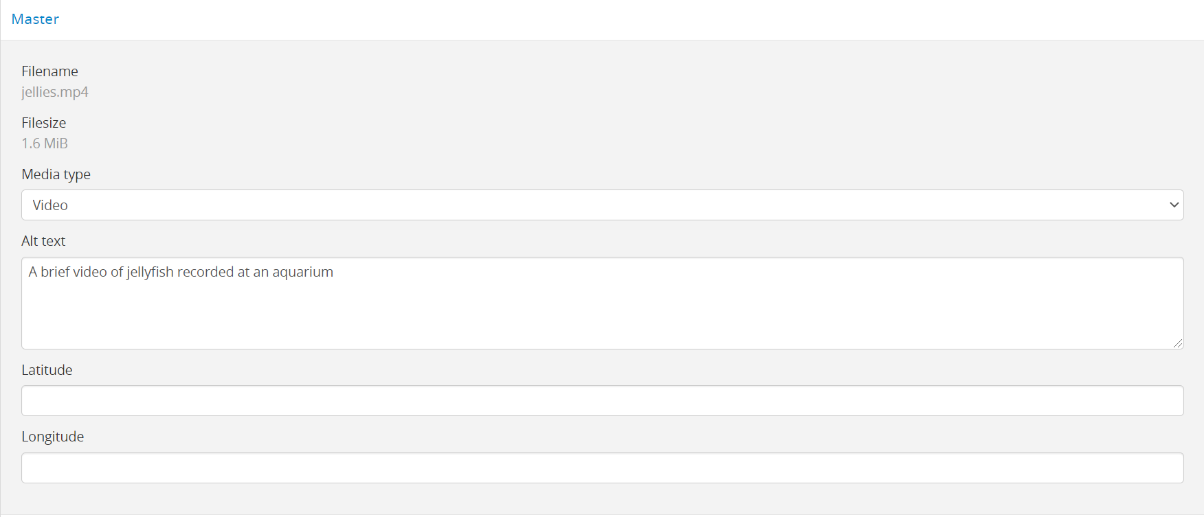 - AtoM will redirect you to the edit page for the digital object. In the information area for the master digital object, add your latitude and longitude values to the fields provided.