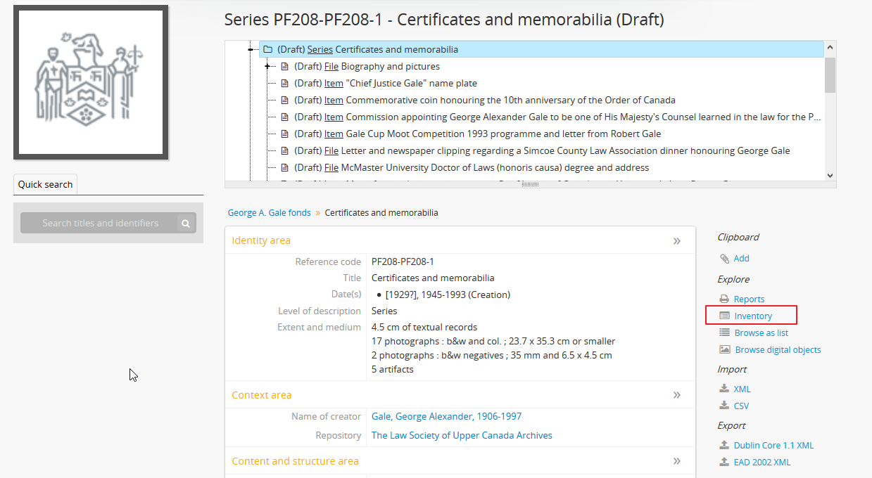 - Click on the “Inventory” link. AtoM will redirect you to the inventory list of lower-level records for the chosen description.