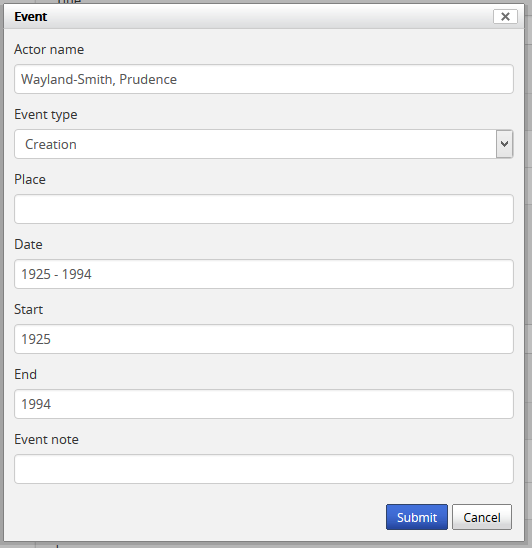 - Enter a new name in the “Actor name” field of the pop-up dialog, and then click “Submit”. The name will be saved as a new authority record when you save the archival description.