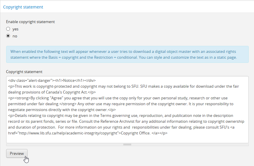 - At the top of the preview tab, a message in a blue box indicates this is the “Copyright statement preview”