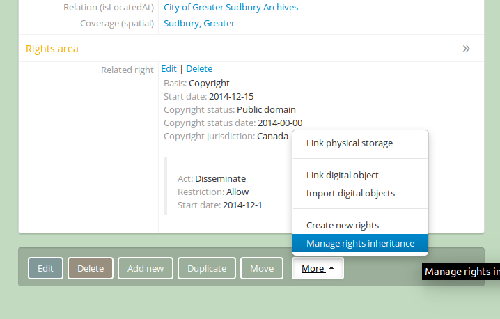 As discussed in the section on entity types, Rights records provide rights related restrictions that can be linked to accession records, archival descriptions and their related digital objects. AtoM Rights metadata elements use PREMIS rights elements. In AtoM restrictions can be based on Copyright(s), License, Statute(s), Policy, or Donor (as in an agreement established with a donor). Rights can be set to be inherited in AtoM, which means that rights added at a higher level (e.g., fonds level) can be inherited by the lower levels (e.g., item level). See Manage rights inheritance, below.