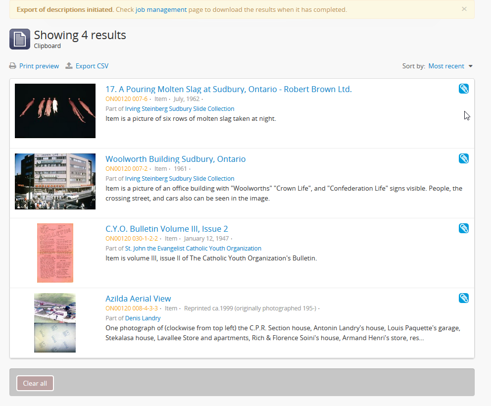 1. The CSV export of the clipboard results will be generated by the job scheduler. After clicking the “Export CSV” link, AtoM will reload the page with a notification about the job at the top, which includes a link to the Jobs page where you can see the status of your job and download the CSV when it is ready. Click on the link in the notification to go to the jobs page.