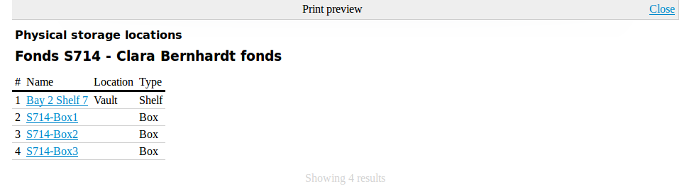 AtoM takes you to a print preview page. A list of storage containers is organized under name, location and type. You can select “print” from your browser and print the report, or you can select “close” and AtoM will return you to the View archival description screen.