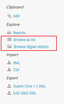 There are two options for browsing within an archival unit included here - the “Browse as list” button, and the “Browse digital objects” button. Additionally, if it has been configured by an administrator, there may also be an option to view an inventory. This section will describe the “Browse as list” button - see the Browse digital objects button and Browse inventory list sections below for the other options in this part of the context menu.