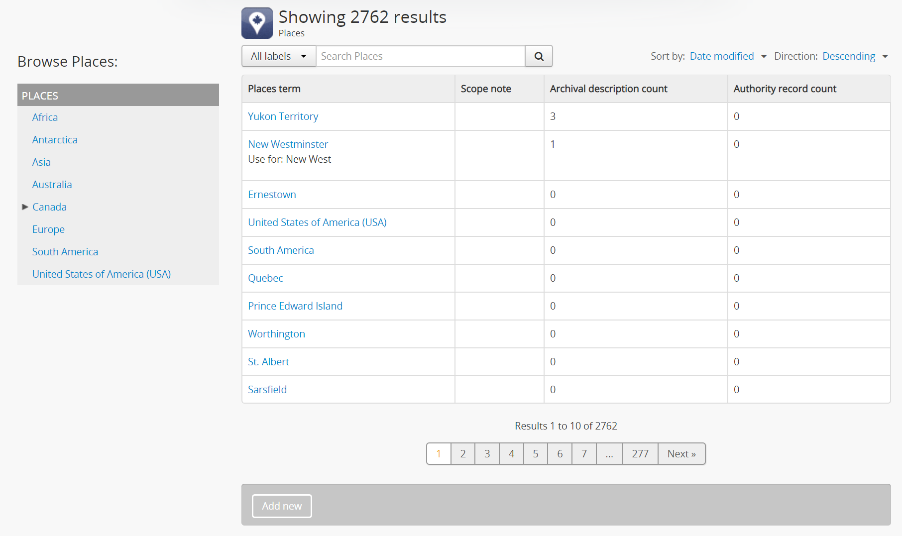 A place is a geographic location registered in a taxonomy and used as an access point in archival descriptions. For more information on managing places in AtoM, see: Terms. For information on adding access points to an archival description, see: Add an access point “on the fly” from an archival description.