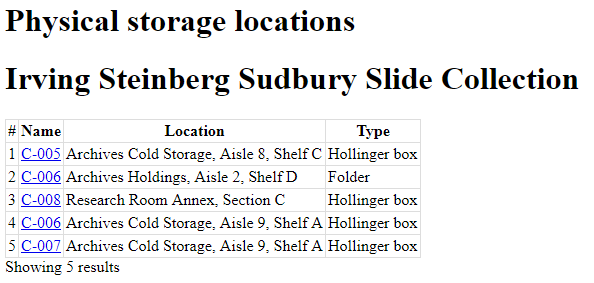 - Click on the hyperlink container name and AtoM takes you to the View Physical storage screen.