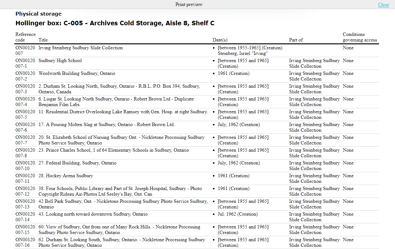 AtoM also provides a simple report that lists all archival description records associated with a particular storage location. This report is optimized for printing, and can be accessed via the Physical storage module. For more information on working with the Physical storage module, see: