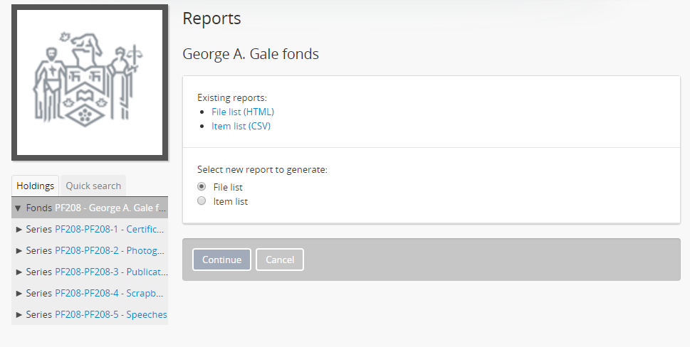 1. If you prefer to generate a new report, ensure that the radio button is set to your preferred report type - “File list” or “Item list.” Click on the Continue button, and AtoM presents a report criteria page for the public user, which provides the following sort options: reference code, title and date (based on start date).