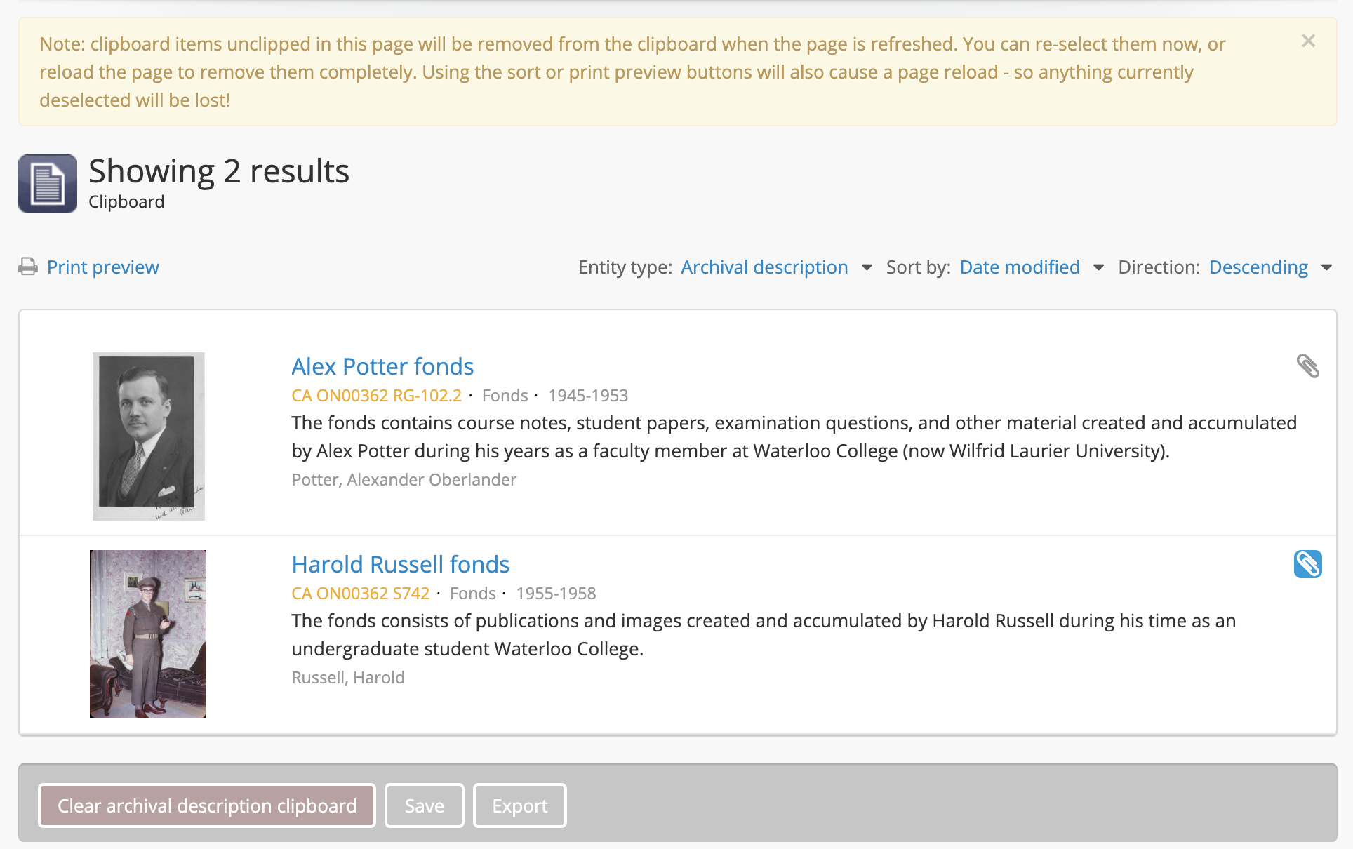 Your previously saved results will load. Note that if you have saved entries from different entity types, they will all be present, though they may not be immediately visible - AtoM shows only one entity type at a time, and by default will show archival description results first. You can switch entity types using the drop-down menu found at the top right above the clipboard results.